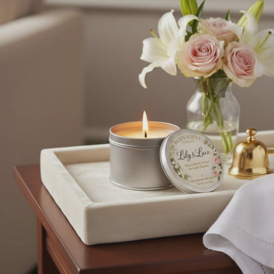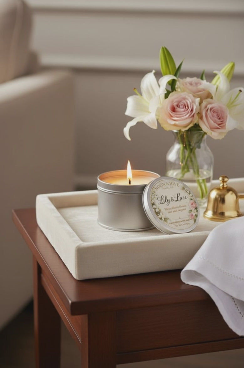 Lily & Lace is a delicate floral candle inspired by sunlit gardens, flowing fabrics, and quiet moments of beauty. Fresh lily blossoms are gently layered with airy florals and a whisper of warmth, creating a scent that feels clean, feminine, and effortlessly refined.
